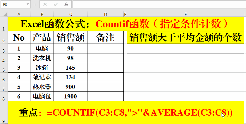 在目標(biāo)單元格中輸入公式:=COUNTIF(C3:C8,">"&AVERAGE(C3:C8))。