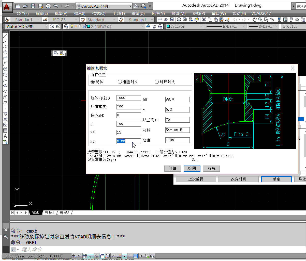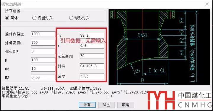 輸入正確的ID,L,E,D,H3,H2,可以獲得鍛管的數(shù)據(jù)。按計(jì)算按鈕,程序會(huì)計(jì)算鍛管的壁厚和補(bǔ)強(qiáng)高度H4(方便邊計(jì)算邊畫(huà)圖,將此數(shù)值輸入SW6中計(jì)算),并獲得1:3削邊時(shí)的高度,過(guò)渡段角度為30°,45°,75°時(shí)候的H2數(shù)值。將其填入數(shù)據(jù)中。再點(diǎn)擊繪圖:
