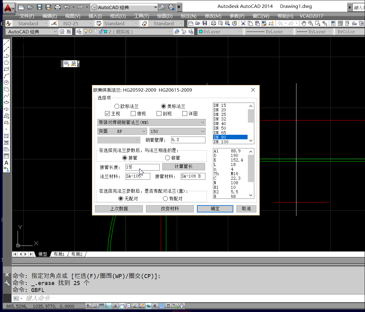 VCAD的管法蘭有兩個(gè),一個(gè)是gbfl(HG/T20592和20615的法蘭)還有一個(gè)是eafl(ASME B16.5和EN的法蘭),下面以gbfl為例。