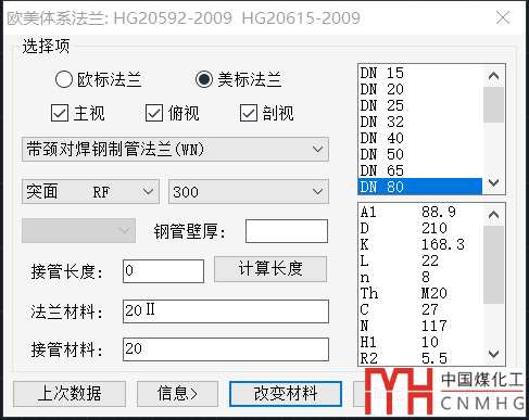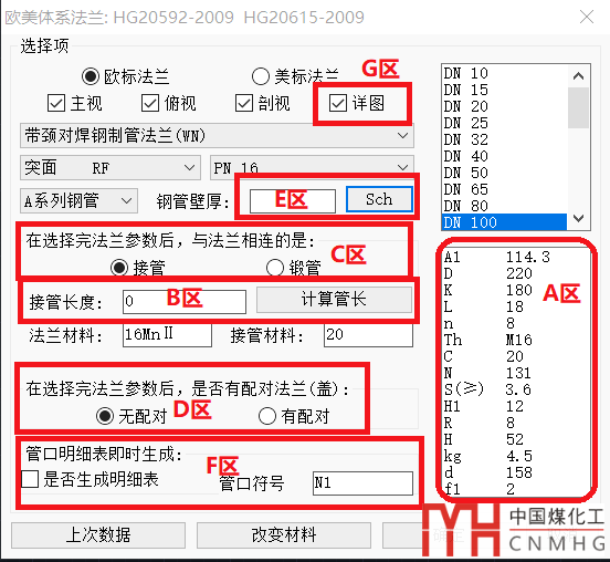 繪制標(biāo)準(zhǔn)件時(shí)通過(guò)選擇法蘭標(biāo)準(zhǔn),主要視圖,法蘭型式,密封面,壓力等級(jí),公稱直徑獲得法蘭的主要尺寸,并將主要尺寸顯示在A區(qū)。
