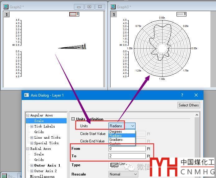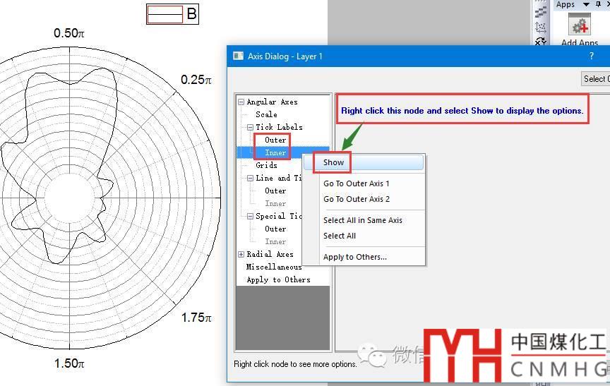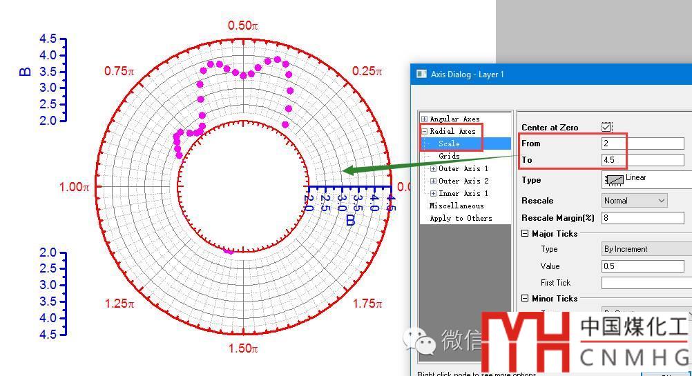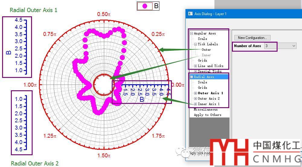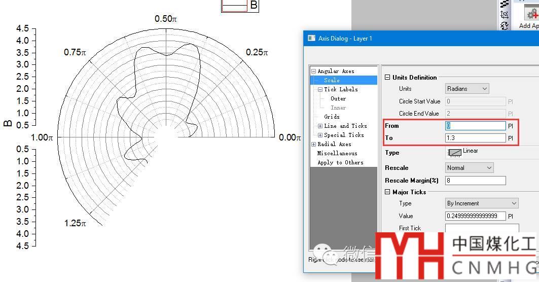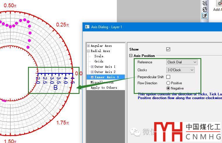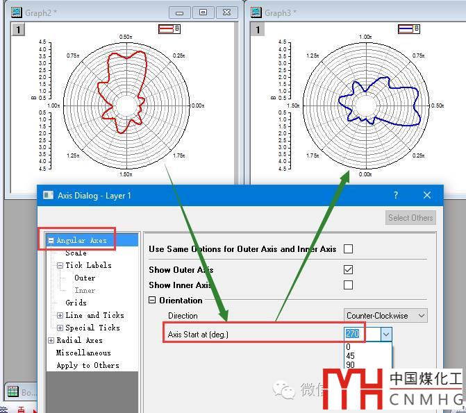 坐標(biāo)軸格式的設(shè)置方法與直角坐標(biāo)系中的類似,詳見Origin(Pro)的繪圖功能:設(shè)置坐標(biāo)軸的格式。
