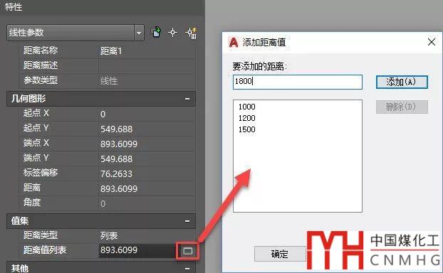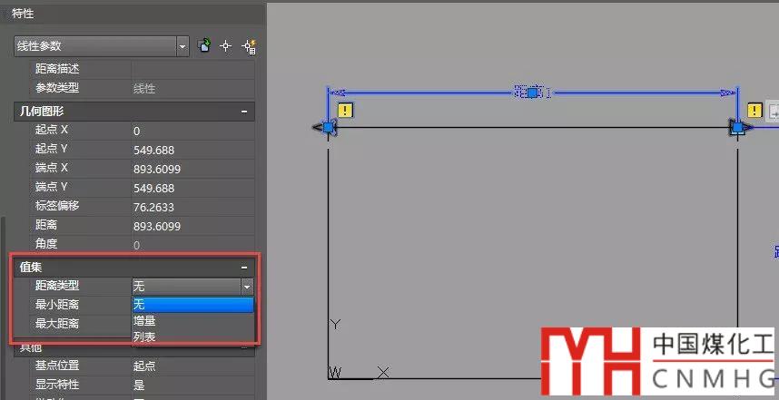 雙擊圖塊重新進(jìn)入塊編輯器,選中橫向的參數(shù),然后打開特性面板(CTRL+1),找到“值集”,單擊“距離類型”后面的列表,選擇“列表”,如下圖所示。