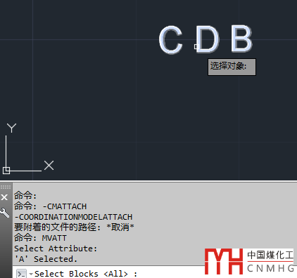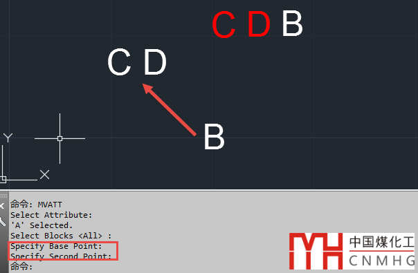 2、輸入MVATT,回車,首先會(huì)提示讓選擇要移動(dòng)的屬性,選中屬性后會(huì)提示讓選擇要修改的圖塊,如下所示。