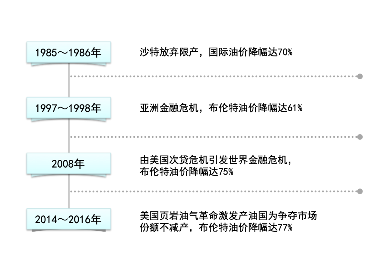 自上世紀80年代至今的40年間,國際石油市場歷經(jīng)多次巨幅震蕩。根據(jù)粗略統(tǒng)計,在本輪油價暴跌之前,國際油價從高點跌幅超過60%的有4次。其中1985~1986年下跌和2014~2016年下跌是由于供給側(cè)的嚴重過剩造成,1997~1998年下跌和2008年下跌與金融危機及其造成的石油市場需求減弱有關。