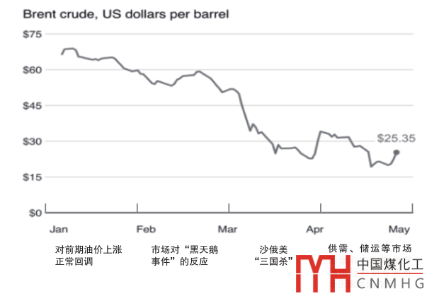 進入2020年以來,國際油價從1月初的60美元以上到如今徘徊在20~30美元之間,劇烈波動中呈不斷下跌之勢,且不同時間段下行因素各有側(cè)重。
