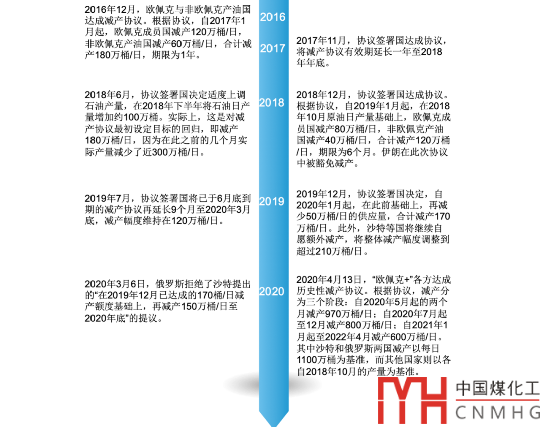 為應對美國頁巖油產(chǎn)量提高帶來的全球原油市場供給過剩,2016年國際油價探底之后,以沙特為首的歐佩克國家和以俄羅斯為首的非歐佩克國家開啟了新型的國際石油合作,即通過達成“歐佩克+”減產(chǎn)協(xié)議聯(lián)手實施減產(chǎn)行動,從而控制全球石油產(chǎn)量,實現(xiàn)國際油價穩(wěn)定。2006年底,歐佩克與非歐佩克產(chǎn)油國達成減產(chǎn)協(xié)議,從次年開始共同減產(chǎn)。減產(chǎn)協(xié)議隨后被多次延長。按照2019年底的協(xié)議,協(xié)議簽署國自2020年1月起,在此前的120萬桶/日基礎上再減少50萬桶/日的供應量,合計減產(chǎn)170萬桶/日。此外,沙特等國將繼續(xù)自愿額外減產(chǎn),將整體減產(chǎn)幅度調(diào)整到超過210萬桶/日。