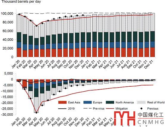 Rystad Energy認為,2020~2021年,全球石油需求將呈現(xiàn)V型曲線,2020年4月為曲線最底部,石油市場到2021年需求下行風險仍很大。預計2020年全球平均需求為8880萬桶/日,比2019年下降10.8%。全年全球需求或?qū)p少40億桶,其中需求減少的一半以上來自東亞、歐洲和北美這些主要需求地區(qū)以外的區(qū)域。歐洲成新冠肺炎疫情最嚴重地區(qū),4月需求同比下降33.5%,2020年全年可能下降12.4%。在悲觀情景下,全球石油需求到2020年12月將減少1050萬桶/日,而2021年12月將減少480萬桶/日。