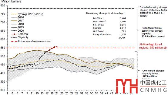 在美國,據(jù)路透社報道,美國能源部下屬的戰(zhàn)略原油儲備基地儲油空間最多能存放約71350萬桶原油,目前已儲備了約6.4億桶原油。此外,原油期貨交割地俄克拉荷馬州庫欣地區(qū)原油存量也在持續(xù)增加。該地原油名義庫容約9100萬桶,實際庫容約為該數(shù)字的90%~95%,庫容歷史最高位曾達到7600萬桶。美國能源信息署日前公布的數(shù)據(jù)顯示,庫欣4月24日的庫存已升至6337.8萬桶。如果未來庫欣庫存仍以每周500萬桶的速度增加,預計該地區(qū)儲油設施利用率將在未來幾周達到上限,庫容被迅速填滿。一旦填滿,WTI原油期貨合約進行實物交割將更加困難。目前貿(mào)易商漂在海上的原油已經(jīng)超過1.6億桶,嚴重的產(chǎn)能過剩使得當月交割的原油成了如同燙手山芋一般的商品。