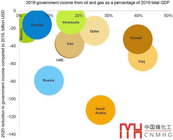 油氣價格下跌意味著產(chǎn)油國政府來自油氣行業(yè)上游的現(xiàn)金收入減少。如圖6所示,Rystad Energy預計,2020年油氣上游為政府貢獻的收入總額與2019年相比將減少7000億美元,降幅為55%。