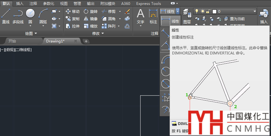 2、分別指定點(diǎn)1、點(diǎn)2作為線性標(biāo)注的起點(diǎn)和終點(diǎn)。