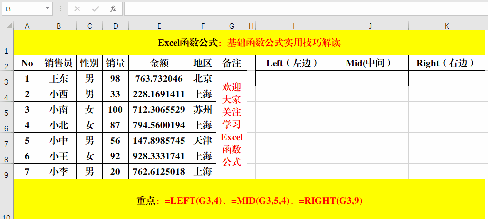 2、Left函數(shù)和Mid函數(shù)是從指定字符的左邊開始按照要求截取字符,而Right函數(shù)是從字符串的右邊開始截取。