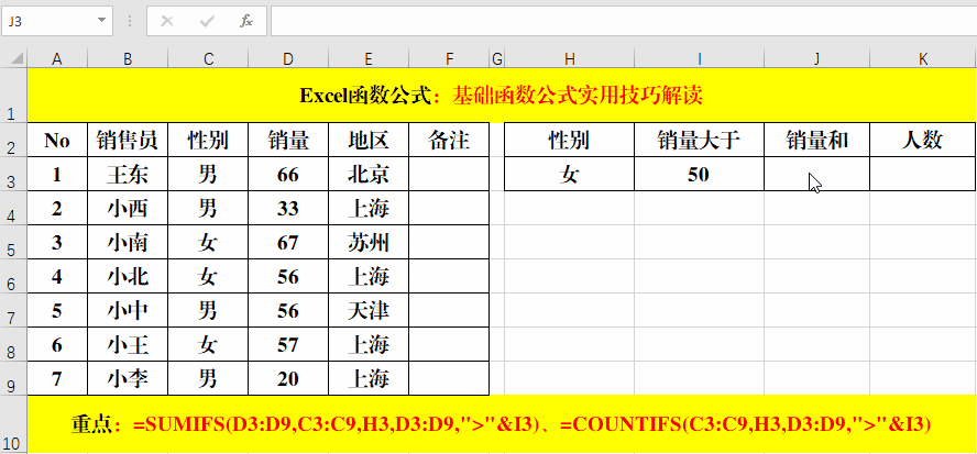 在目標(biāo)單元格中輸入公式:=SUMIFS(D3:D9,C3:C9,H3,D3:D9,">"&I3)、=COUNTIFS(C3:C9,H3,D3:D9,">"&I3)。