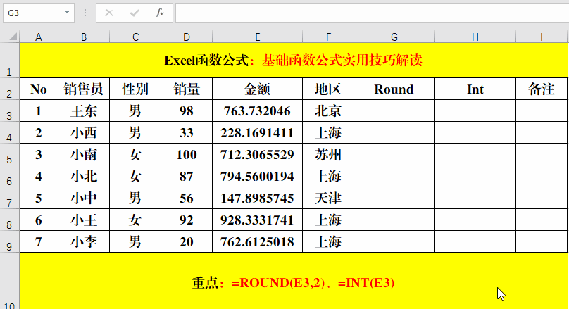 在目標(biāo)單元格中輸入公式:=ROUND(E3,2)、=INT(E3)。