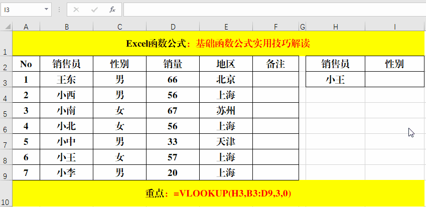在目標(biāo)單元格中輸入公式:=VLOOKUP(H3,B3:D9,3,0)。