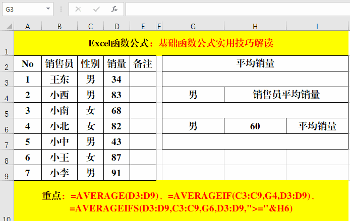 在目標(biāo)單元格中分別輸入:=AVERAGE(D3:D9)、=AVERAGEIF(C3:C9,G4,D3:D9)、=AVERAGEIFS(D3:D9,C3:C9,G6,D3:D9,">="&H6)。