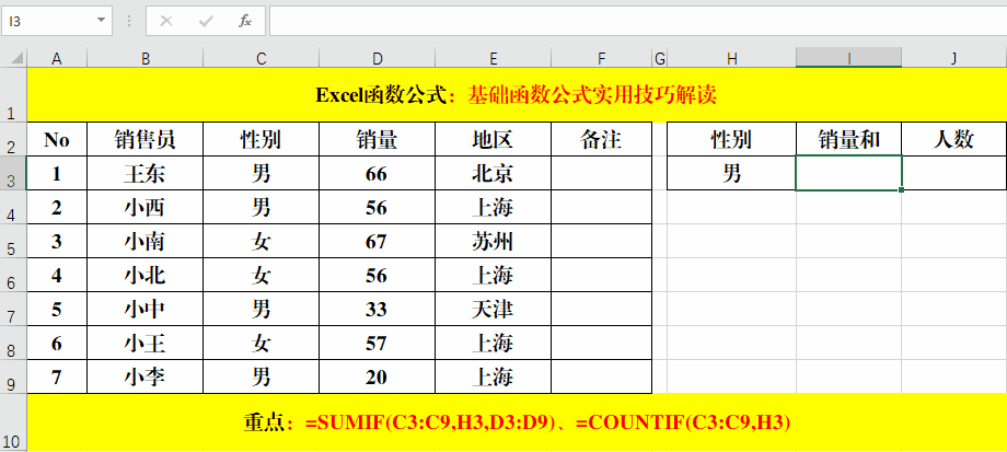 在目標(biāo)單元格中輸入公式:=SUMIF(C3:C9,H3,D3:D9)、=COUNTIF(C3:C9,H3)。