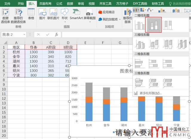 選擇數(shù)據(jù)源,然后選擇插入二維堆積柱形圖,操作如所示: