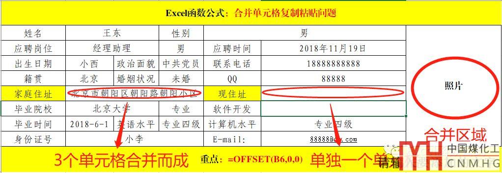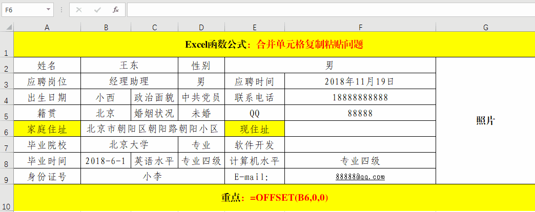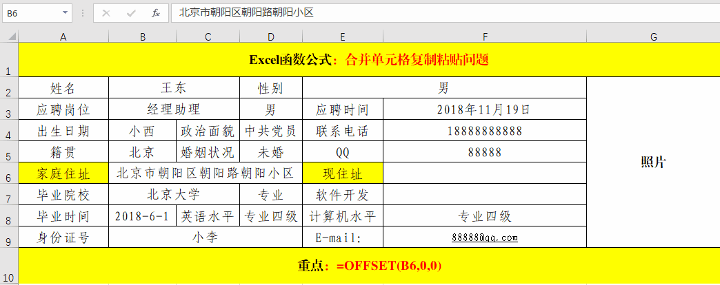 在目標(biāo)單元格中輸入公式:=OFFSET(B6,0,0),其中B6為“家庭住址”所在的單元格地址。