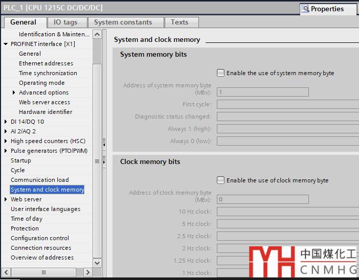 我們以CPU1215C為例,打開其硬件組態(tài),在屬性頁面中,找到“系統(tǒng)與時鐘存儲區(qū)(System and clock memory)”,如下圖: