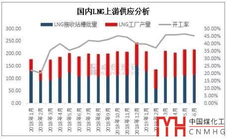 另外LNG工廠產(chǎn)量約571.81萬噸,同比增長37.08%。產(chǎn)量明顯增加的主要原因:一方面是因?yàn)?/span>2019年上半年國內(nèi)管道氣資源充裕,工廠開工情況良好,產(chǎn)量水平相對較高;另一方面,2018年4月份開始冬季保供工作,儲(chǔ)氣庫注氣等影響下,工廠氣源受到一定限制,產(chǎn)量普遍較低。因此兩方面影響下,2019年上半年的工廠產(chǎn)量有近40%的增速。