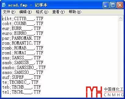 上面介紹的替換字體文件的介紹,其實選項對話框中“替換字體文件”下面還有一項“字體映射文件”可以更好地完成自動替換字體的任務(wù)。如果我們有一批圖紙,圖紙中使用了相同的字體,這些字體找不到或者我們需要統(tǒng)一將這些字體替換顯示成其他字體的話,就可以設(shè)置字體映射文件,字體映射文件的擴展名是*.fmp,這就是一個純文本文件,在之前我們曾經(jīng)介紹過,只需要在前面寫上要替換的字體名,后面寫上替換的字體文件名,中間用分號隔開就好了,如圖所示。