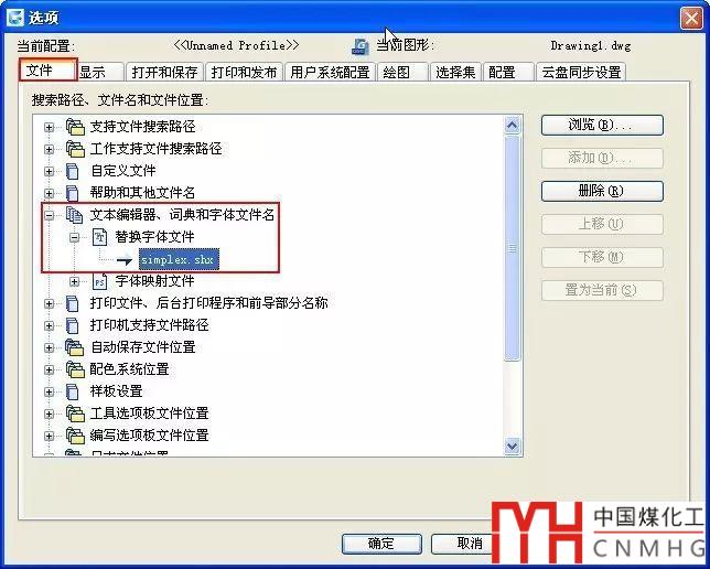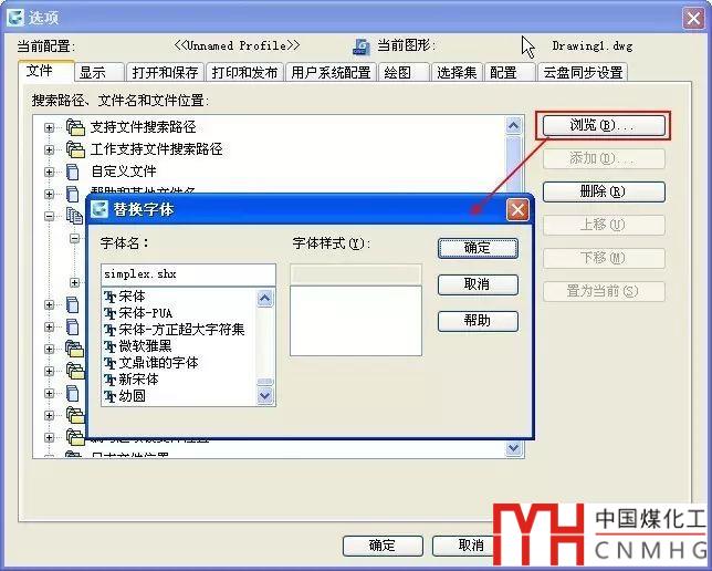 其實CAD默認已經(jīng)設(shè)置好了替換字體,這個字體可以直接在選項對話框中設(shè)置。