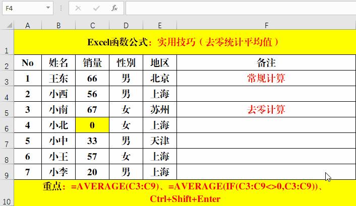 首先判斷C3:C9范圍中的值是否等于0,如果不等于0,返回對應(yīng)的單元格值,并參與AVERAGE的計算當(dāng)中。