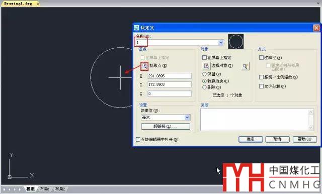 1、新建一張圖紙,畫一個(gè)圓,輸入B,回車,將圓定義成圖塊,塊名設(shè)置為1,插入點(diǎn)設(shè)置在圓的圓心,如下圖所示。
