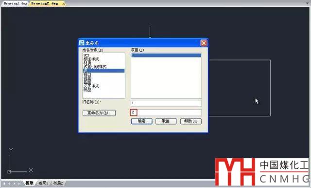 2、在左側(cè)的列表中選擇“塊”,在右側(cè)的列表中選擇“1”,在“重命名”框內(nèi)輸入2,如下圖所示,單擊確定按鈕,將圖塊名從1改成2 。