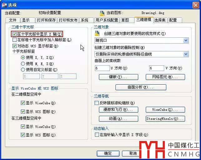 在選項(xiàng)OP對(duì)話框的“顯示”、“系統(tǒng)”和“選擇集”選項(xiàng)卡都沒有找到相關(guān)設(shè)置,最后發(fā)現(xiàn)影響十字光標(biāo)是否空心的參數(shù)藏在“三維建模”選項(xiàng)卡里,取消勾選“在十字光標(biāo)中顯示Z軸”后,十字光標(biāo)就不空心了,如下圖所示。