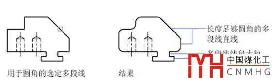 如果想對多段線上適合圓角半徑的每條線段的頂點處插入相同長度的圓角弧,可在倒圓角時使用“多段線(P)”選項,如下圖所示。