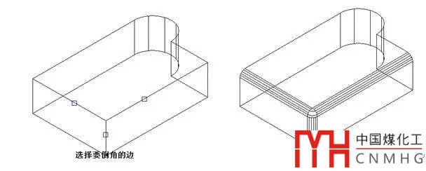 CAD的Fillet命令不僅可以對二維線形進行倒角,也可以對三維實體進行倒角。當(dāng)選擇三維實體上需要倒角的邊時,會提示輸入圓角半徑,輸入半徑后可以選擇一條或多條邊同時倒圓角,如下圖所示。