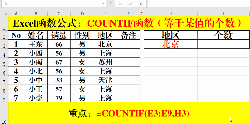 在目標(biāo)單元格中輸入公式:=COUNTIF(E3:E9,H3)。