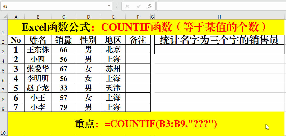 在目標(biāo)單元格中輸入公式:=COUNTIF(B3:B9,"???")。