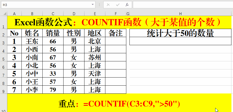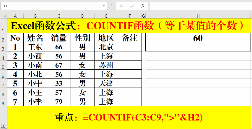 在目標(biāo)單元格中輸入公式:=COUNTIF(C3:C9,">"&H2)。