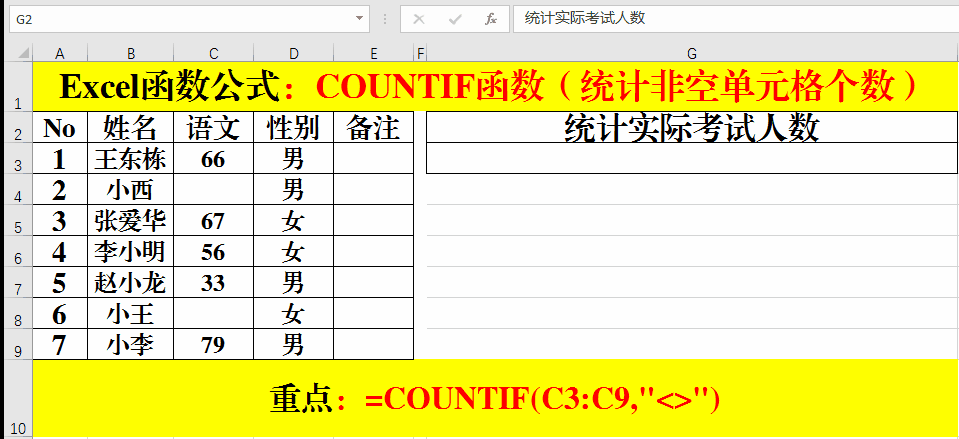 四、統(tǒng)計(jì)不等于某值的單元格的數(shù)量。