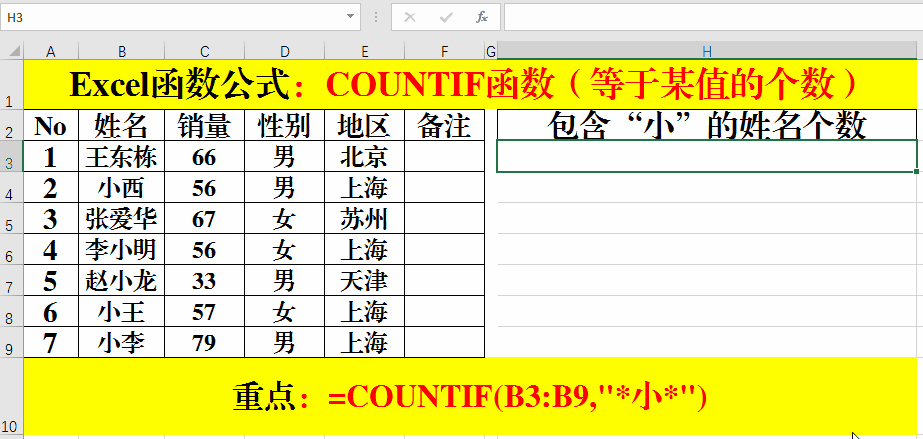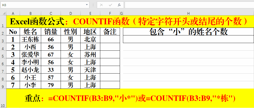 在目標(biāo)單元格中輸入公式:=COUNTIF(B3:B9,"小*")或=COUNTIF(B3:B9,"*棟")。