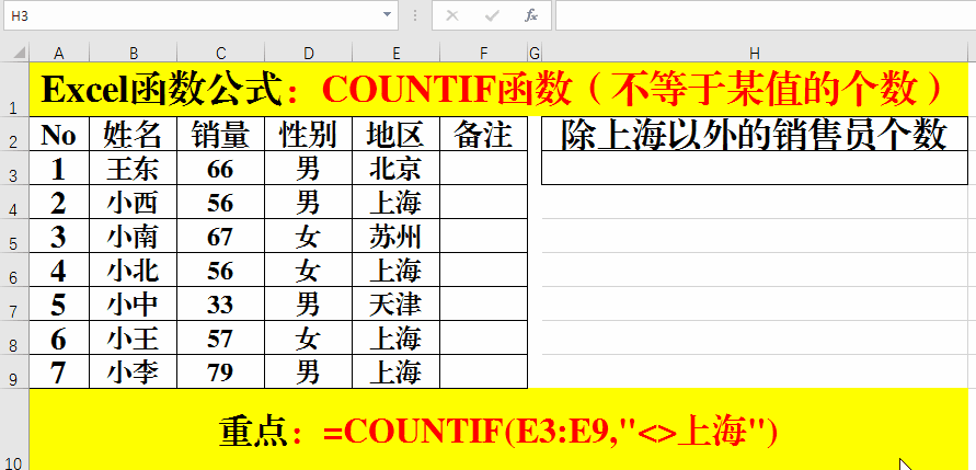 在目標(biāo)單元格中輸入公式:=COUNTIF(E3:E9,"<>上海")。