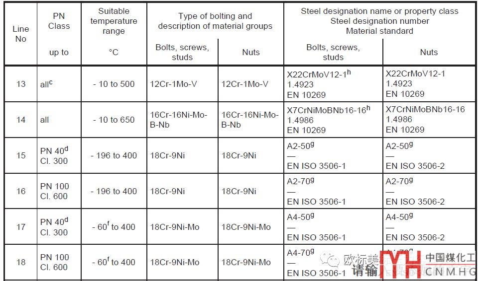 由于國內(nèi)和歐洲對商品級不銹鋼緊固件使用上是有些差別的,國內(nèi)在化工裝置中的壓力容器主體螺栓/螺柱很少用商品級的不銹鋼緊固件;而歐洲這是很常見的事情。國內(nèi)只有法蘭標(biāo)準(zhǔn)如化工部HG/T 20592中明確可以使用商品級不銹鋼緊固件使用要求等見下圖,注意看下表的匹配關(guān)系:A2-70的螺柱配的不是常規(guī)認(rèn)為第一檔的A2-50的螺母;螺柱和螺母都是用的A2-70或都是用的A2-50.