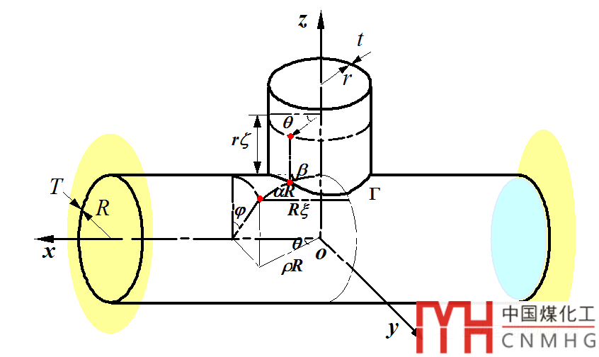 分析法本質(zhì)上是建立圓柱殼以及主殼與支管的交貫線方程,利用Morley方程與修正的Morley方程代替扁殼方程,采用精確的連續(xù)條件,利用偏微分方程,求解主殼和支管上的各種應(yīng)力。