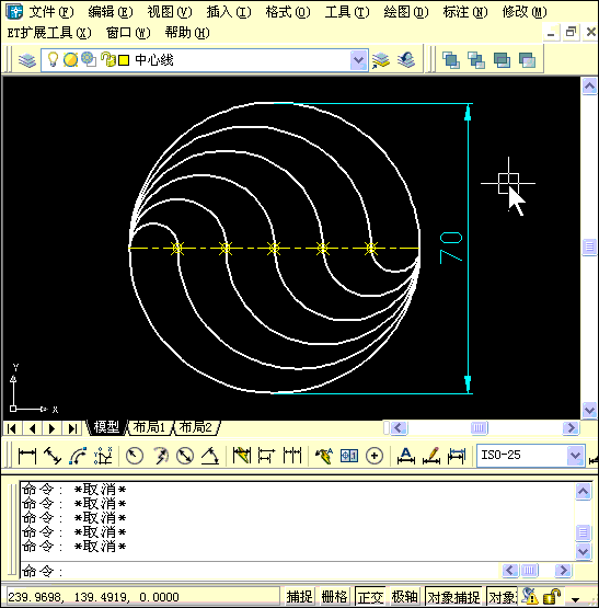 這個(gè)視頻沒有創(chuàng)建輔助線,也沒有用定數(shù)等分,而是直接輸入分?jǐn)?shù)70/6來(lái)創(chuàng)建最小的半圓,然后利用夾點(diǎn)的縮放編輯時(shí)輸入復(fù)制C選項(xiàng),然后依次將不同半徑的 圓復(fù)制出來(lái),最后利用環(huán)形陣列得到了另外一半。這種思路也非常獨(dú)特。大家在看操作的時(shí)候要仔細(xì)觀察命令行的輸入的每個(gè)參數(shù)和提示,否則有可能畫不出來(lái)。