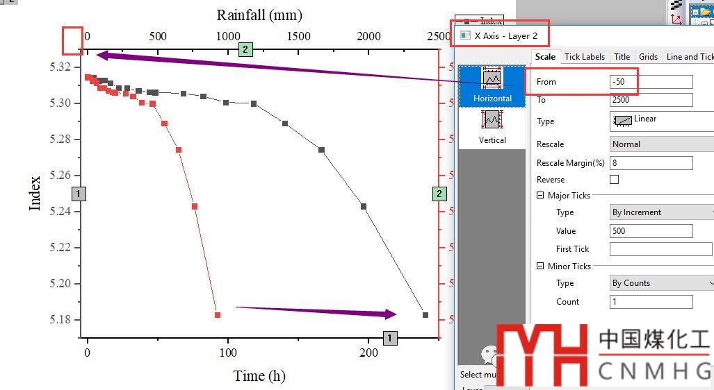 為實現(xiàn)上下兩個X軸對應(yīng)的數(shù)據(jù)點重合,需要上下兩個坐標(biāo)軸的刻度也要成一定的比例關(guān)系。