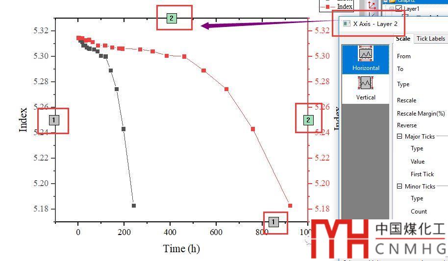 選中Layer2,切換到Link Axis Scale頁面。對于雙Y軸圖形,默認(rèn)設(shè)置X軸為Straight(1 to 1),Y軸為None。
