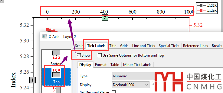 恢復(fù)對Layer2的勾選,雙擊上面的坐標(biāo)軸Top X,打開Axis格式設(shè)置對話框,其中坐標(biāo)軸上帶方框的數(shù)字也表明該坐標(biāo)軸所屬的圖層。