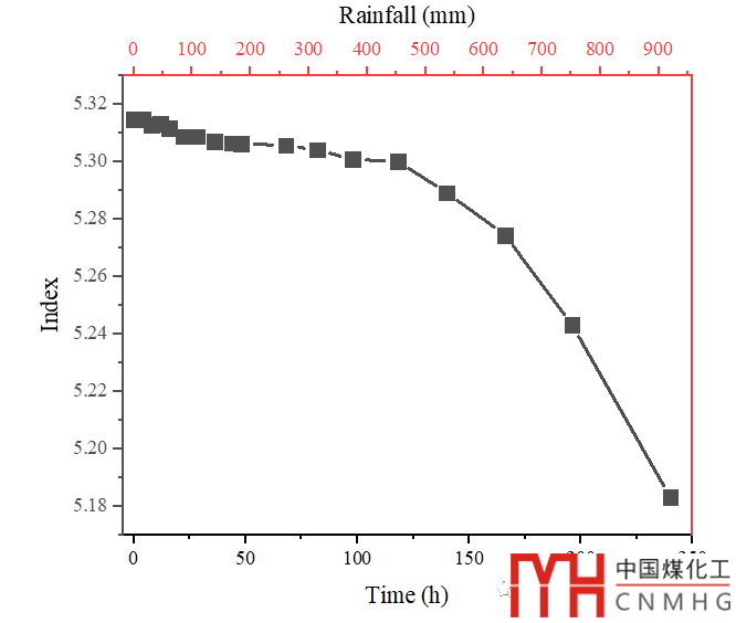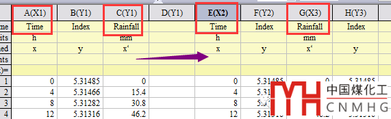 以下數(shù)據(jù)為例,其中Time為X軸數(shù)據(jù),Index為Y軸數(shù)據(jù),Rainfall為第二個X軸數(shù)據(jù)(或者叫衍生X軸,是由Time經(jīng)過計算得到的,此處使用的是線性的計算關(guān)系)。