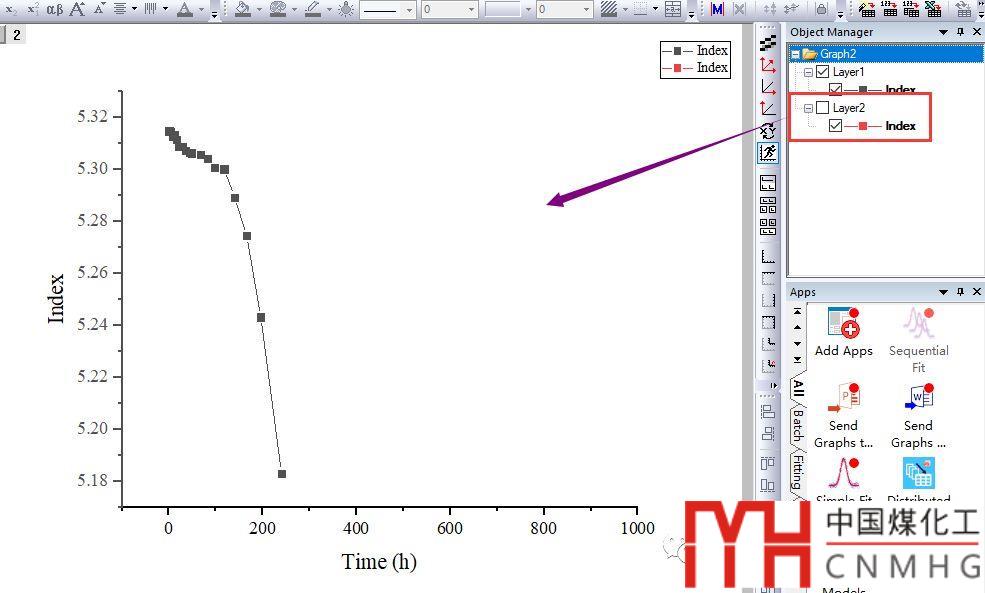 在Object Manager里將Layer2的勾選去掉,則只顯示Layer1及在Layer1中的曲線,Layer2中的曲線被隱藏了。這也說明了雙Y軸圖形,其實是2X2Y圖形。