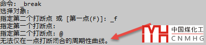 用打斷BREAK功能可以通過選擇兩個點(diǎn)斷開圓或橢圓,斷開后只會保留其中一段。如果想用打斷于點(diǎn)的功能將圓或橢圓在某一點(diǎn)斷開卻不行,命令行會提示:圓弧不能是 360 度或無法僅在一點(diǎn)打斷閉合的周期性曲線,如下圖所示。