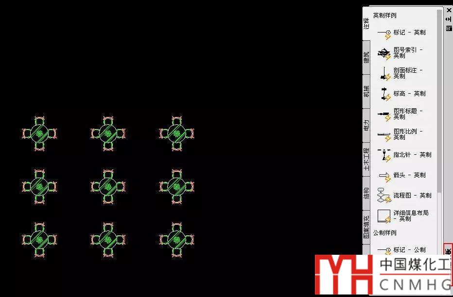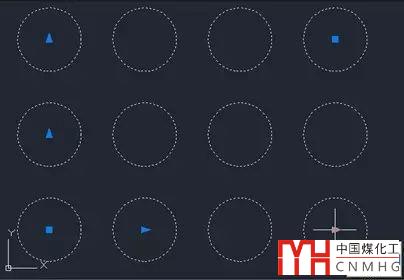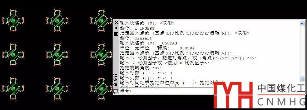 輸入MINSERT命令,回車,根據(jù)提示依次輸入塊名、比例、角度、行列數(shù)、行列間距,就可以完成一個(gè)圖塊矩陣的插入,如下圖所示。