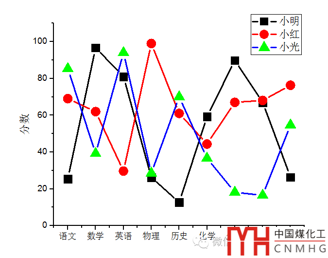 如果以Line + Symbol的形式表示,似乎有點(diǎn)混亂,不能直觀地區(qū)分各位同學(xué)的各科成績(jī)。