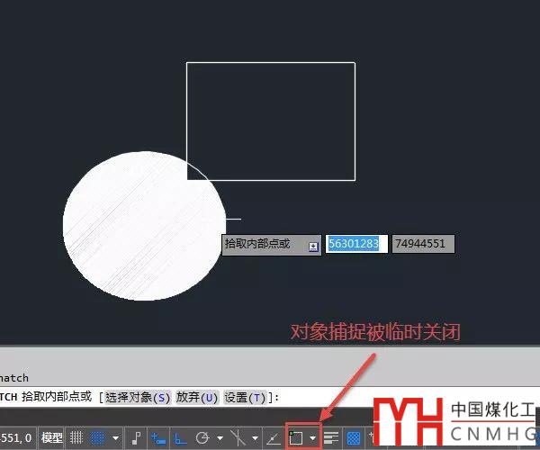 因?yàn)槲覀冃枰叭√畛鋮^(qū)域內(nèi)的一點(diǎn),如果捕捉圖形邊界,反而會(huì)無(wú)法填充。當(dāng)CAD自動(dòng)關(guān)閉對(duì)象捕捉的時(shí)候,我們就沒(méi)有必要強(qiáng)行去捕捉了。